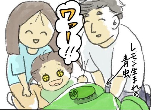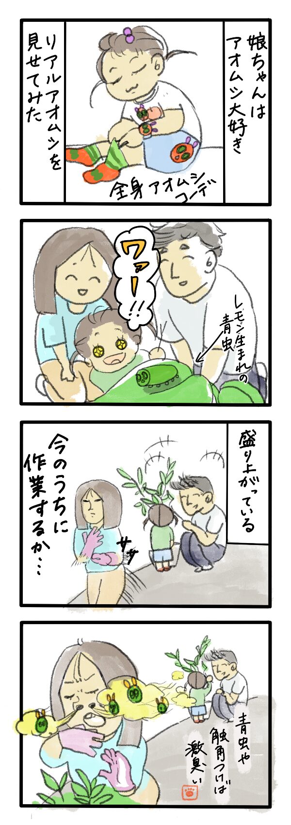 あおむしVS二歳児 家族ネタ 2026.01.03 レモンの木には毎日アゲハ蝶がやってきます。無農薬でレモンを作りたいので追い払っていましたが…力尽きて無抵抗になってみたら木がつるっぱげになりましたとさ。娘ちゃんは、青虫の成長を楽しんでいたので良しとします。